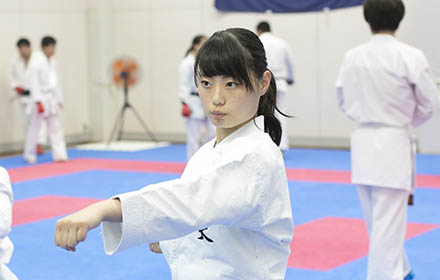 空手道部は、「明るく、元気に」をモットーに毎日練習に励んでいます。